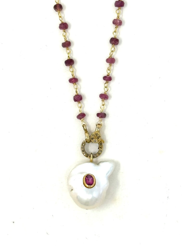 White baroque pearl embedded ruby on small rubies roundel chain 17